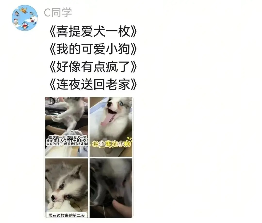 和原主人约定好国庆去交接崽崽。这边网友满心欢喜,做了各种准备;那边原主人好心,怕网友东西不全,直接把狗子的家底全部打包交接。
